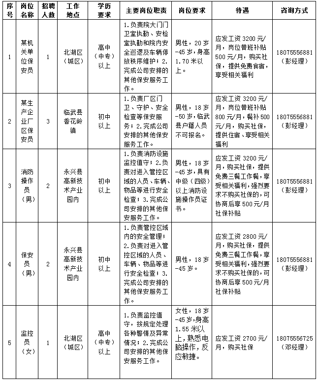 3.联系地址:郴州市北湖区人民东路35号保安服务大楼四楼人力资源部。