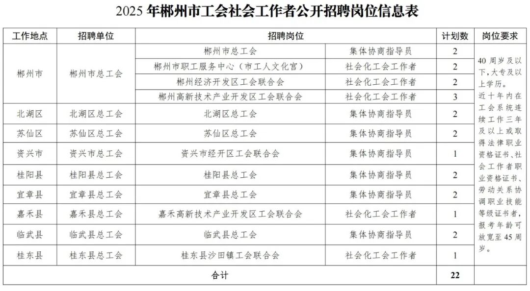 2025年郴州市工会社会工作者招聘22人。具体招聘岗位、计划数及招聘要求等详见《2025年郴州市工会社会工作者公开招聘岗位信息表》(简称《岗位信息表》附件1)。
