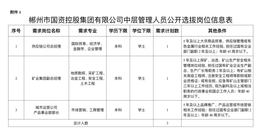 本次面向社会公开选拔中层管理人员3人,具体岗位及相关要求详见附件1(郴州市国资控股集团有限公司中层管理人员公开选拔岗位信息表)。