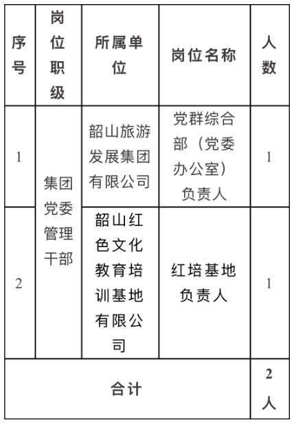根据工作需要,现面向社会(含韶旅集团系统内部成员单位)公开招聘集团中层管理人员2人,相关事项公告如下: