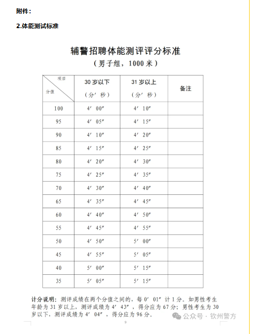 1.体能测试。资格审查合格的考生参加体能测试。体能测试项目为长跑,即男子1000米,体能测试计算成绩,评分标准附后。