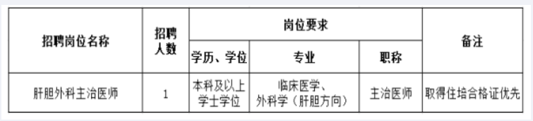 根据医院发展需要,现面向社会急招肝胆外科主治医师1人,有关招聘事项公告如下: