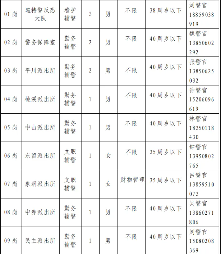 本次计划招聘辅警13名,具体招聘岗位及要求: