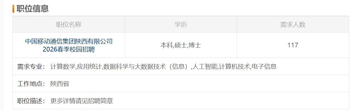 详见陕西移动2026校园招聘公告