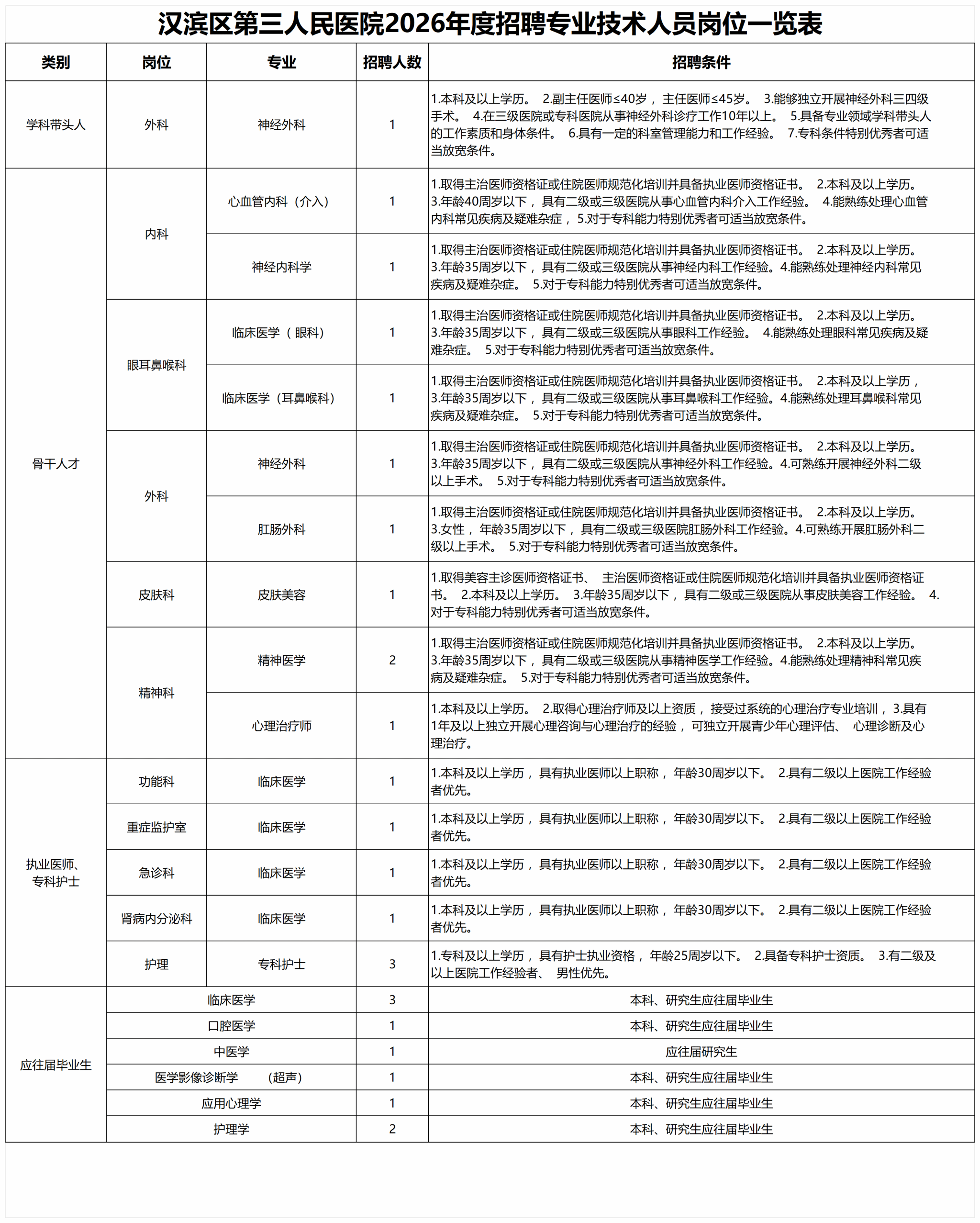 具体岗位、专业及名额详见下图《汉滨区第三人民医院2026年度招聘专业技术人员岗位一览表》。
