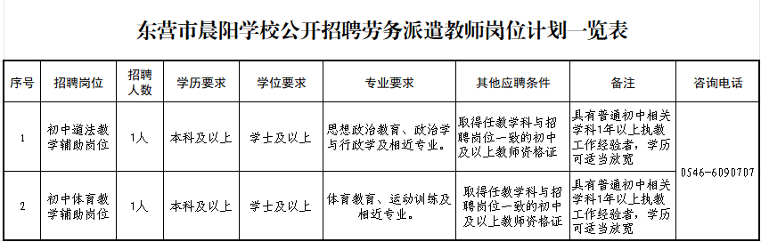 因工作需要,东营市晨阳学校委托东营市东凯人力资源服务有限公司面向社会公开招聘劳务派遣教师,现将有关事项公告如下:
