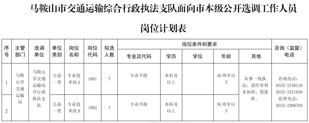 马鞍山市交通运输综合行政执法支队本次计划面向市本级公开选调事业单位工作人员14名,具体岗位及选调资格条件见《马鞍山市交通运输综合行政执法支队公开选调人员岗位计划表》。