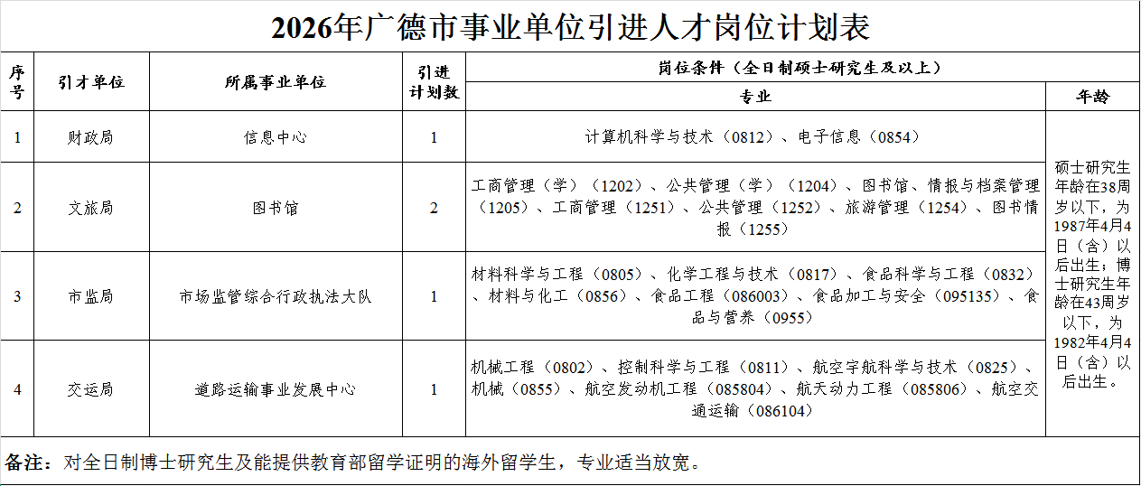具体要求详见附件1(2026年广德市事业单位引进人才岗位计划表)。