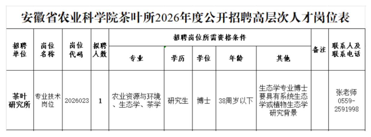 安徽省农业科学院茶叶研究所2026年博士招聘公告