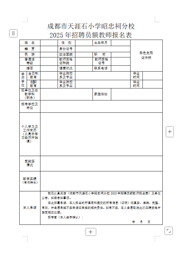 成都市天涯石小学昭忠祠分校2025年招聘员额教师报名表
