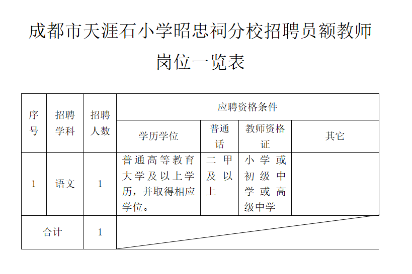 本次招聘员额教师共计1名(招聘岗位详见《成都市天涯石小学昭忠祠分校招聘员额教师岗位一览表》)。
