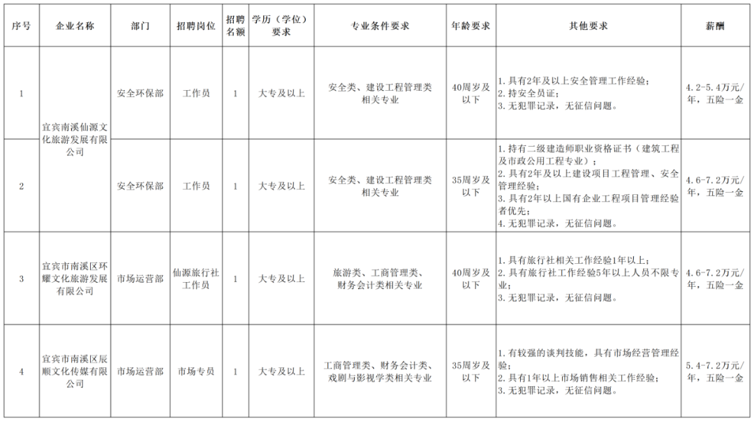 四川宜众劳务开发有限公司按照公开、平等、竞争、择优的原则,面向社会公开招聘4名工作人员,派遣至宜宾南溪仙源文化旅游发展有限公司及下属子公司工作。现将有关事宜公告如下: