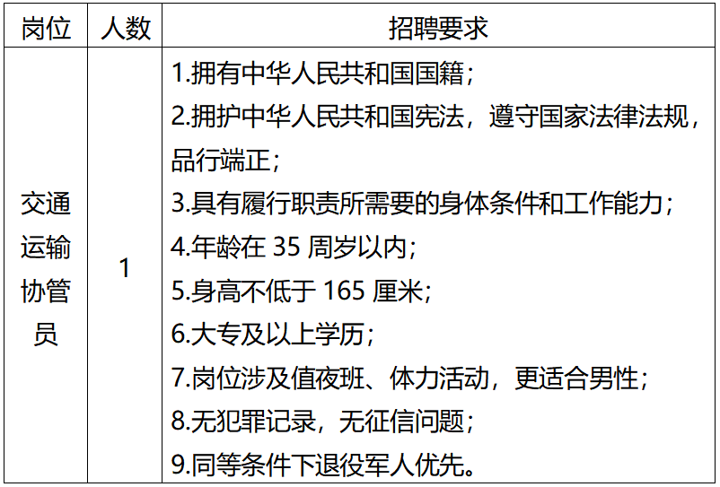 四川宜众劳务开发有限公司按照公开、平等、竞争、择优的原则,面向社会公开招聘1名交通运输协管员,派遣至南溪区交通运输局(交通运输综合执法大队)工作。现将有关事宜公告如下: