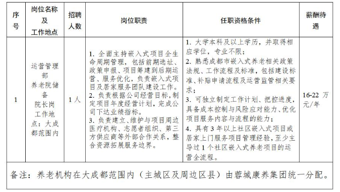 成都蓉城康养集团有限公司,是成都市属国企成都兴城投资集团有限公司新设成立的专业化公司,致力于打造本土领军的品质康养全站式服务商。公司重点以机构养老、社区嵌入式养老为主要业务方向,到2029年基本建立覆盖成都全域的机构养老服务网络,全面铺开社区居家养老服务等增值业务,建立健全机构、社区、居家“三位一体”的养老服务体系,在银发经济全面来临的时代,全力把“蓉城康养”打造成国企办养老事业的金字招牌和广大长者的不二之选。
