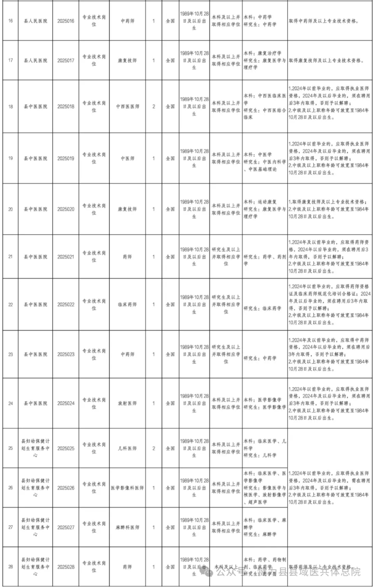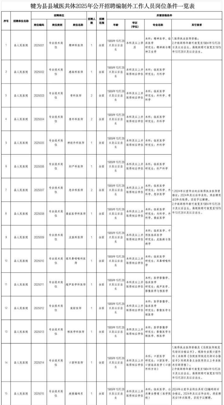 符合《犍为县县域医共体2025年公开招聘编制外工作人员岗位和条件要求一览表》(附件1,以下简称《一览表》)所需资格条件要求的人员,其中,2025年规培结业生须提供住院医师规范化培训合格证书或住院医师规范化培训结业考试合格证明。