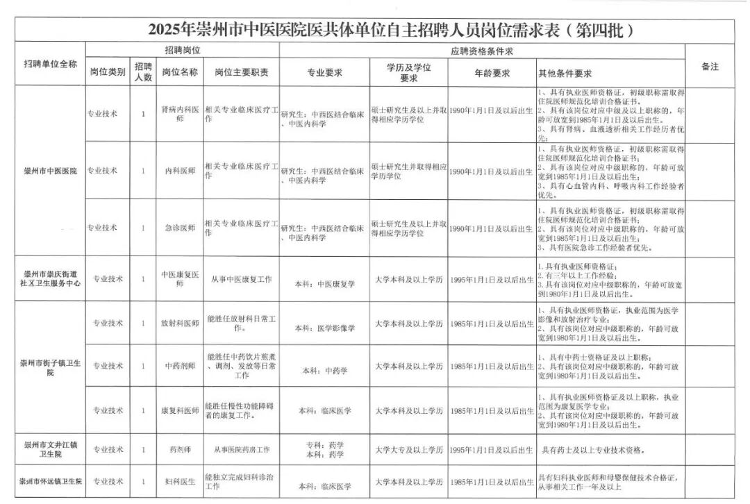 《2025年崇州市中医医院医共体单位自主招聘人员岗位需求表(第四批)》