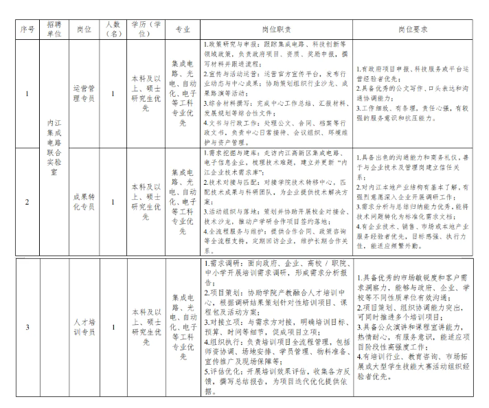 内江高新人才发展有限责任公司成立于2022年11月,是内江高新科技投资服务有限责任公司全资子公司,核心职能包括人力资源服务、科技中介服务等,专注劳务派遣业务领域。电子科技大学・四川内江集成电路联合实验室是电子科技大学与内江市深化产学研合作共建的创新平台,聚焦集成电路领域技术研发、成果转化与人才培养。现受该联合实验室委托,我司面向社会公开招聘劳务派遣工作人员3名,岗位服务于实验室相关工作开展。