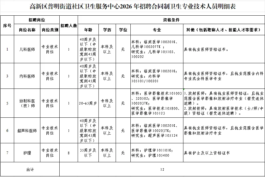 绵阳高新区普明街道社区卫生服务中心因业务发展需要,拟面向社会公开招聘12名合同制卫生专业技术人员。