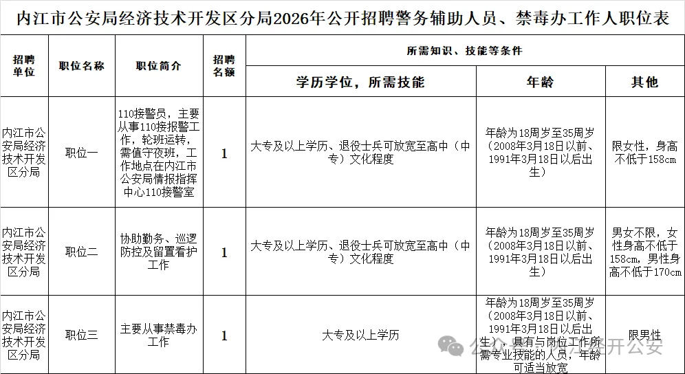 根据工作需要,按照《四川省公安机关警务辅助人员管理办法》《内江市公安机关警务辅助人员使用管理办法》《内江市公安机关警务辅助人员招聘办法》等规定,遵循公开、平等、竞争、择优的原则,内江市公安局经济技术开发区分局决定面向社会招聘警务辅助人员。现将有关事项公告如下:
