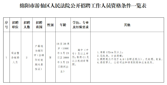 3.报名材料:报名时需提供《绵阳市游仙区人民法院公开招聘工作人员报名表》(附件1)、第二代身份证、毕业证、学位证、户籍、工作经历证明材料及岗位要求的其他材料(退伍证等)的原件扫描件、本人证件照电子版。
