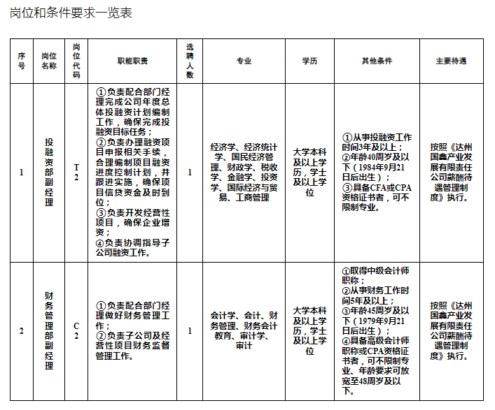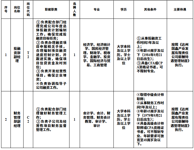 为进一步选优配强达州高新区国有企业人员配置,决定面向社会公开选聘达州国鑫产业发展有限责任公司专业技术人员2名。现将有关事项公告如下。 一、公开选聘职位及名额 本次公开选聘投融资部副经理1名、财务管理部副经理1名。具体选聘岗位及条件要求详见《岗位和条件要求一览表》(附件1)。
