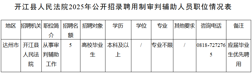 达州市达川区人民法院2025年公开招录聘用制审判辅助人员7名。