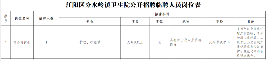 按照公开、平等、竞争、择优的原则江阳区分水岭镇卫生院拟面向社会公开招聘临聘人员1名,现将有关事项公告如下。