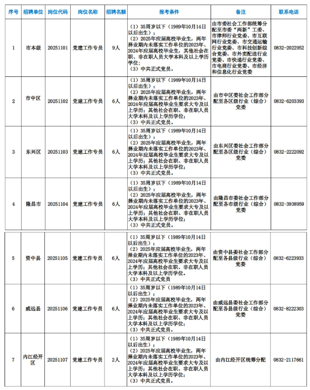 全市招聘新兴领域党建工作专员41名(编外聘用人员,合同制),不限性别,正式聘用后选派至相关市、县行业(综合)党委所在市、县部门从事新兴领域党建工作。