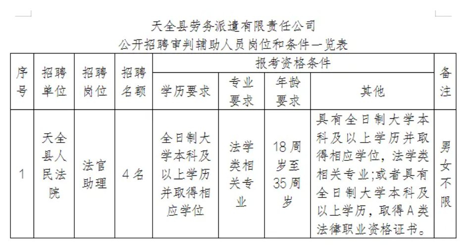 根据工作需要,天全县法院拟面向社会公开招聘审判辅助人员4名,现将有关事项公告如下: