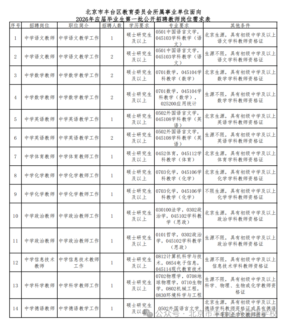北京市丰台区外国语学校本次招聘岗位共计18个,具体需求如下: