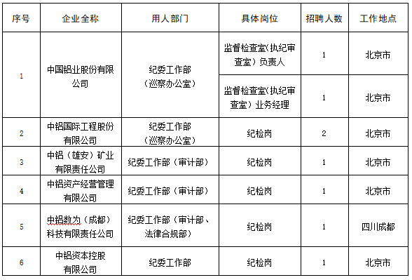 中国铝业集团有限公司(以下简称中铝集团)根据工作需要,决定为所属部分二级单位纪委公开招聘8名工作人员。现将有关事项公告如下: