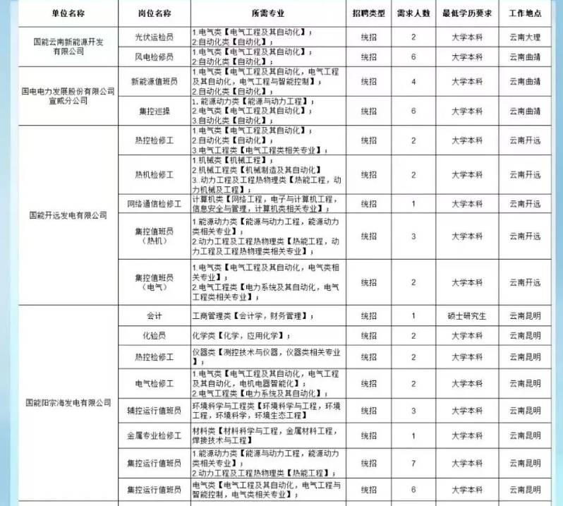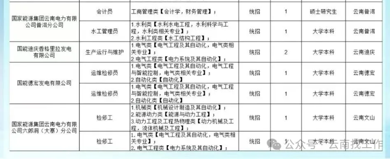 本次统考统招面向国家能源集团云南电力有限公司所属8家子分公司的生产、管理岗位,包括但不限于以下专业: