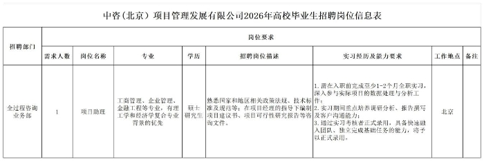 中咨(北京)项目管理发展有限公司成立于2023年,是中咨公司深入贯彻国资国企改革部署、加速推进集团化发展的重要举措。公司以“五五战略”为指引,秉持“内外协同、人才强企”理念,持续打造具有中咨特色的高端智库型工程咨询服务品牌,围绕招标代理、造价咨询、项目管理、工程审计、咨询等服务领域开展业务,致力于成为具有中咨(北京)发展特色,以招标代理、造价咨询为龙头,贯穿工程建设全过程的工程咨询服务集成商。