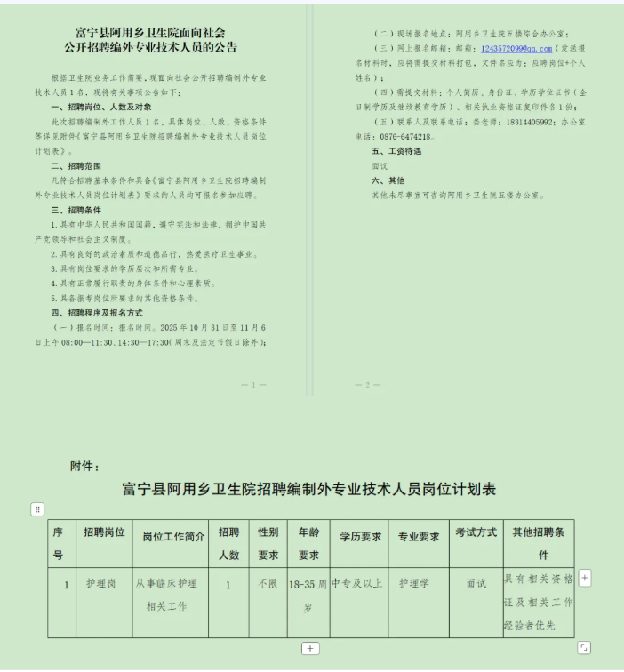 此次招聘编制外工作人员1名,具体岗位、人数、资格条件等详见附件《富宁县阿用乡卫生院招聘编制外专业技术人员岗位计划表》。