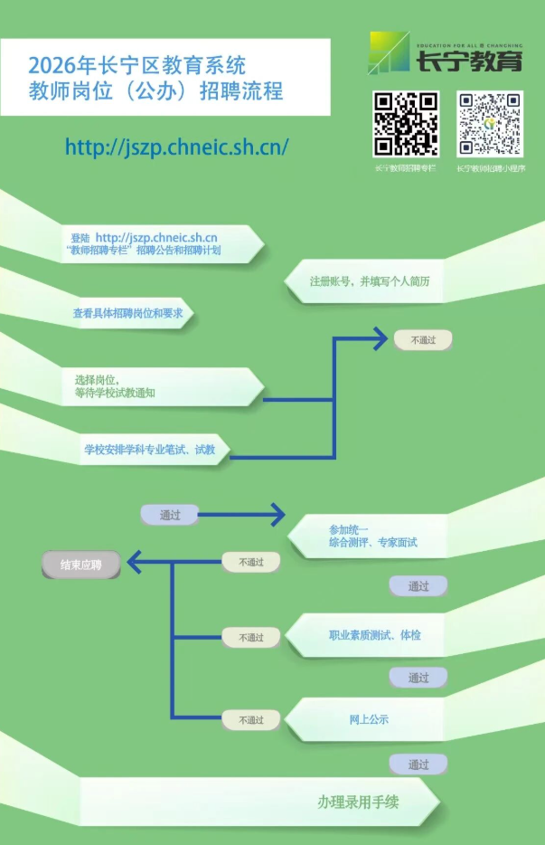 1.发布招聘信息。长宁区教师招聘信息通过“长宁教育人才服务中心”网站(https://jszp.chneic.sh.cn)发布。