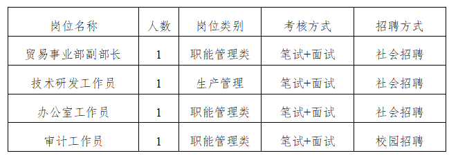 为拓宽选人、用人渠道,进一步充实人才队伍、满足公司战略发展需要,助力有机农业公司实现高质量发展,拟招聘贸易事业部副部长1人、技术研发部工作员1人、办公室工作员1人、审计部工作员1人。
