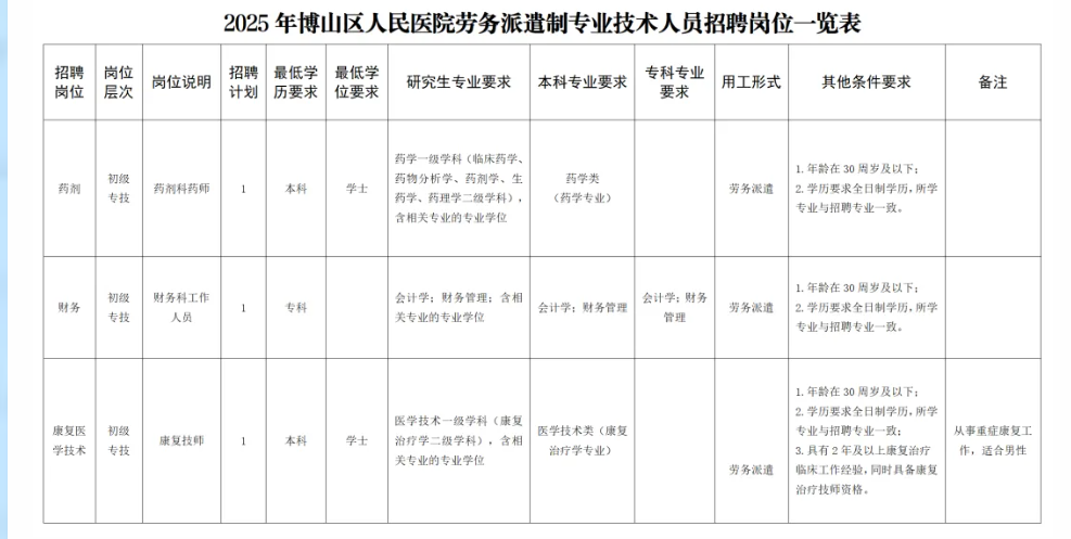 1.遵纪守法,品德优良,热爱本职工作,有较强的沟通交流能力、适应能力、团队协作精神和服务意识,工作认真负责。2.身心健康,具备适应岗位要求的身体条件和心理素质。3.符合招聘岗位的学历、学位、专业、年龄(年龄以身份证为准)、资格要求和其他条件。具体岗位及要求详见《2025年博山区人民医院劳务派遣制专业技术人员招聘岗位一览表》(附件1)。