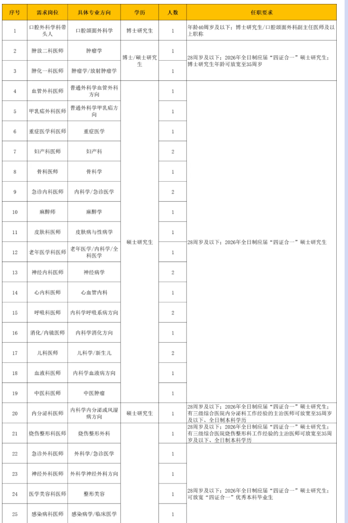2.医学博士,由院长直聘,待遇一人一议,安家补贴50-100万元,在职期间免费提供一套房子(两室一厅)供居住。