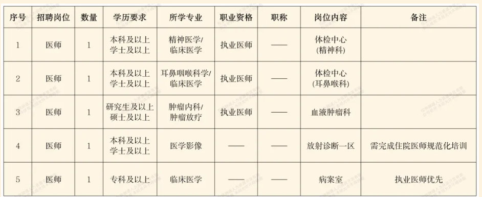 根据工作需要,本次计划招聘5岗位5人,岗位为医院直聘。