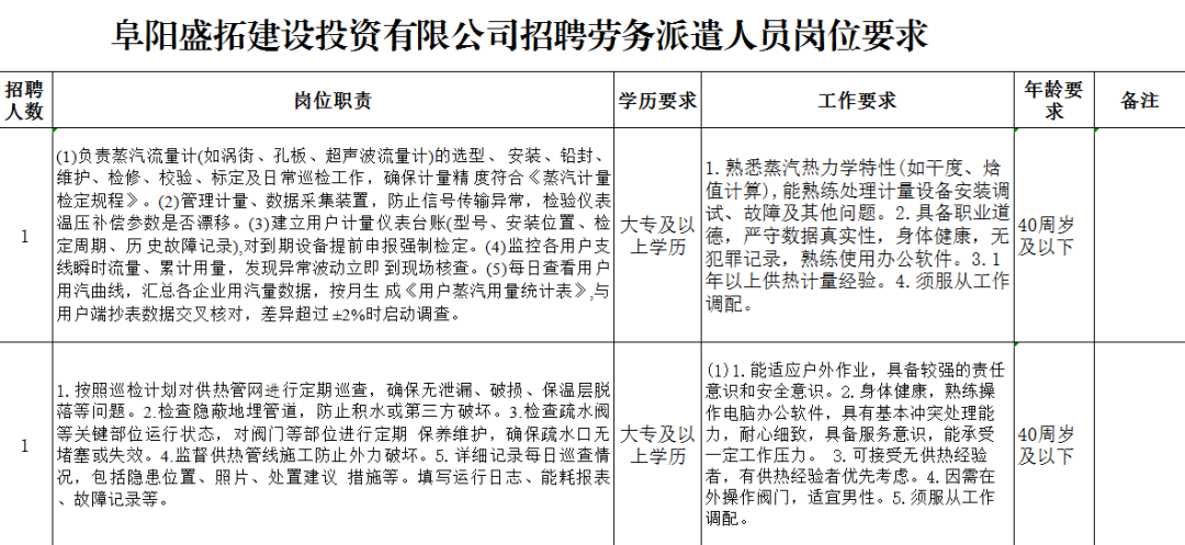 招聘岗位、条件详见《阜阳盛拓建设投资有限公司招聘劳务派遣人员岗位要求表》(附件1)。