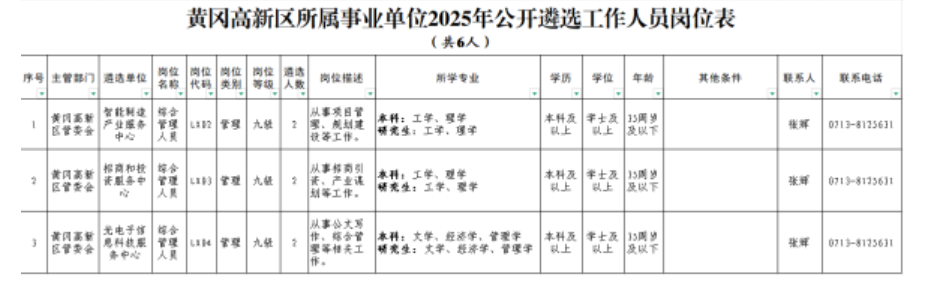 为建设高素质专业化事业单位工作人员队伍,赋能高新技术产业高质量发展,黄冈高新区所属事业单位现公开遴选6名工作人员。现将有关事项公告如下:
