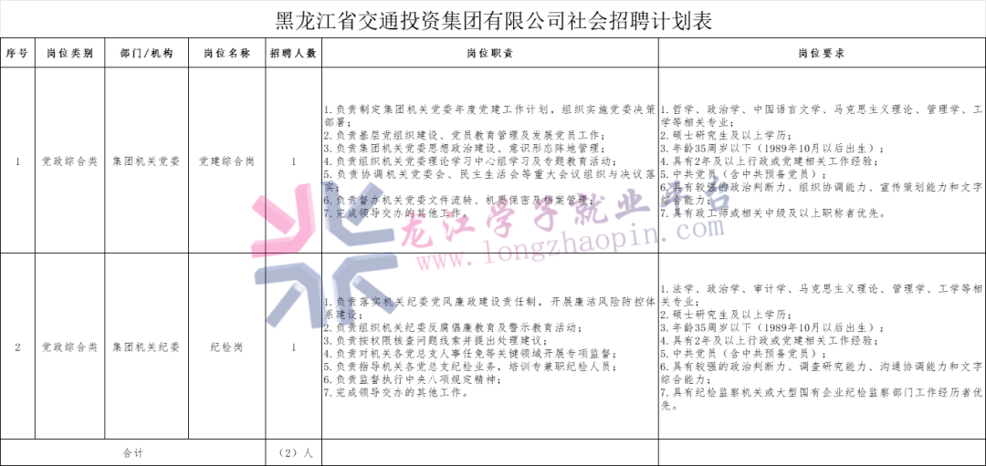 集团总部及权属企业计划招聘5人,详见附件:《黑龙江省交通投资集团有限公司社会招聘计划》。