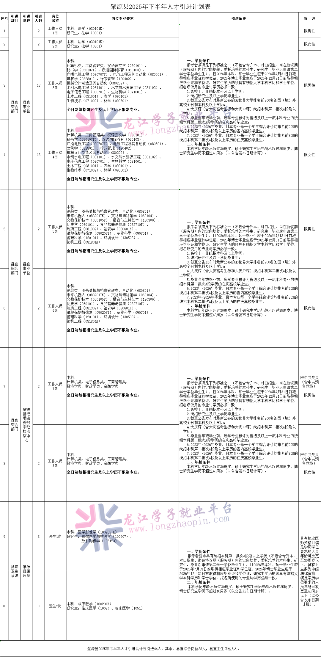 2025年下半年计划引进44人。其中,县直综合部门引进38人,县直卫生系统引进6人。具体引进岗位、数量及专业等要求详见《肇源县2025年下半年人才引进计划表》(附件1)。