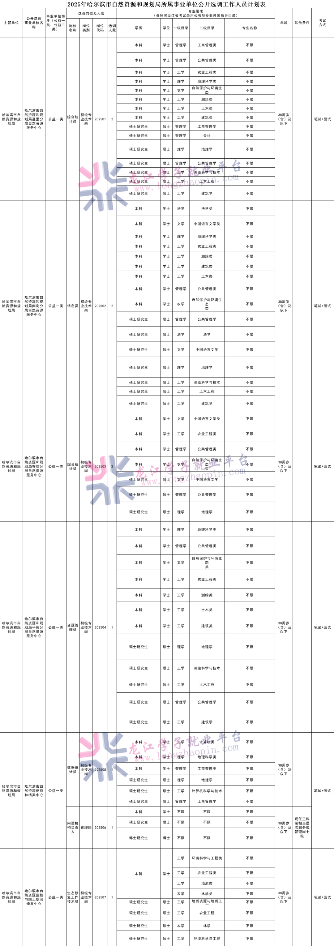 具体选调岗位、人数、条件等详见附件《2025年哈尔滨市自然资源和规划局所属事业单位公开选调工作人员计划表》(以下简称《计划表》)。