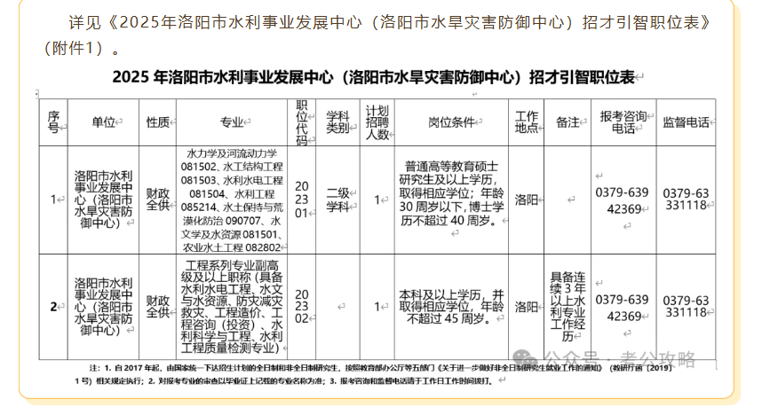 详见《2025年洛阳市水利事业发展中心(洛阳市水旱灾害防御中心)招才引智职位表》(附件1)。