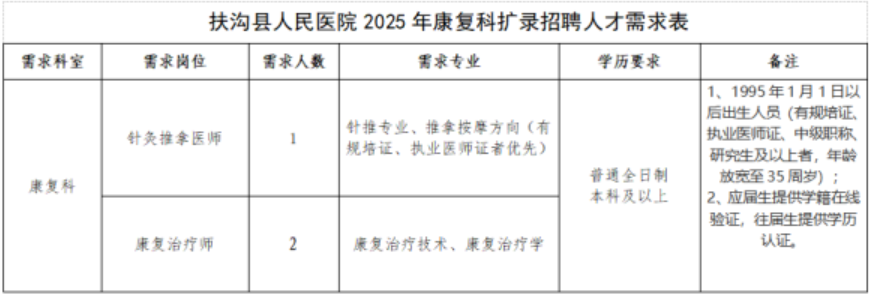 扶沟县人民医院关于2025年春季招聘扩录3名康复专业技术人员的公告