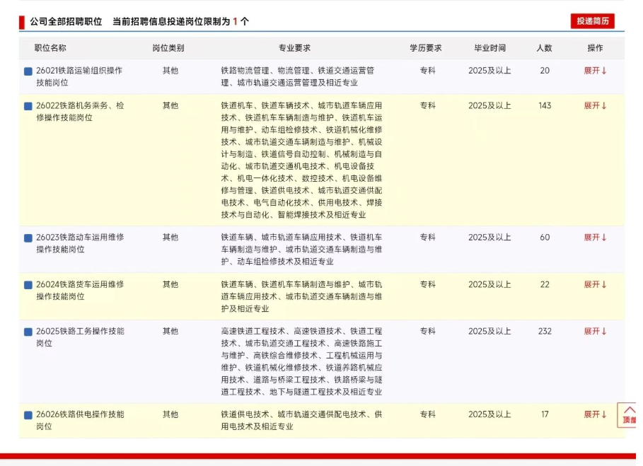 (二)符合招聘岗位要求的专业条件,列入国家招生计划,2026年、2025年毕业的未与其他任何单位签订就业协议或劳动合同的全日制普通高校大专(高职)毕业生。在校期间所学专业为铁路方向或所学主要课程中包含铁路专业课程。