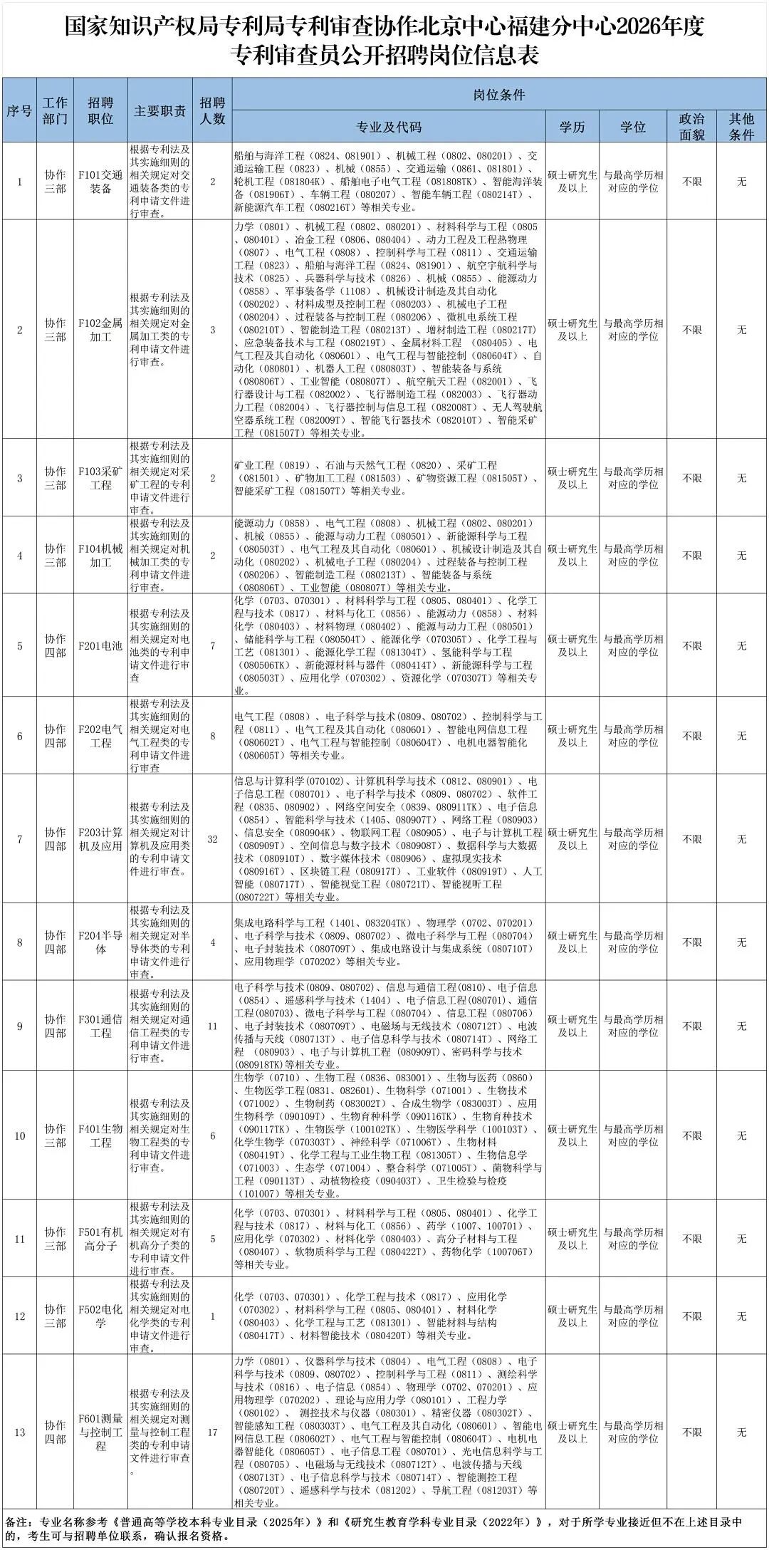 本次公开招聘专利审查员100名,岗位信息及要求详见《国家知识产权局专利局专利审查协作北京中心福建分中心2026年度专利审查员公开招聘岗位信息表》(附件)。
