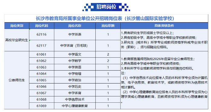 3.公费师范生岗位不设置开考比例。高校毕业研究生、骨干教师、学科竞赛教练和体育教练员岗位,报名人数与岗位职数的比例须达到3:1(含)方可开考。未达比例则核减或取消该岗位职数,被取消的岗位或被核减的职数于2025年11月13日(星期四)在长沙市教育局官网教师招聘栏目公布。
