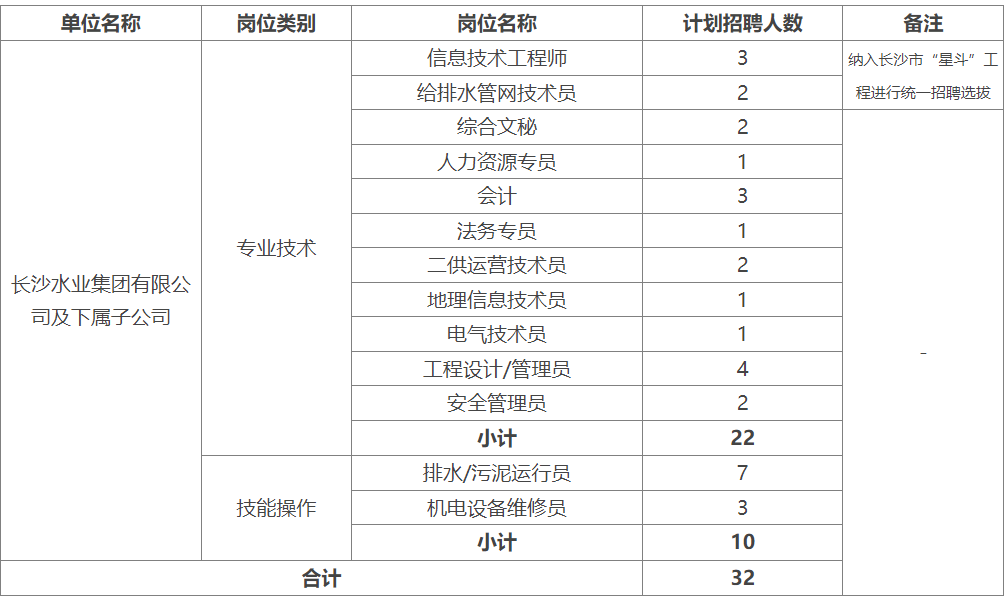 信息技术工程师、给排水管网技术员岗位纳入长沙市“星斗”工程进行统一招聘选拔,详情以长沙市人力资源社会保障局《长沙市“星斗”工程2026年国企类硕博人才选拔公告》文件内容为准,在长沙市人事考试服务网(https://csks.cs12333.com/ui/examp/#/)报名。
